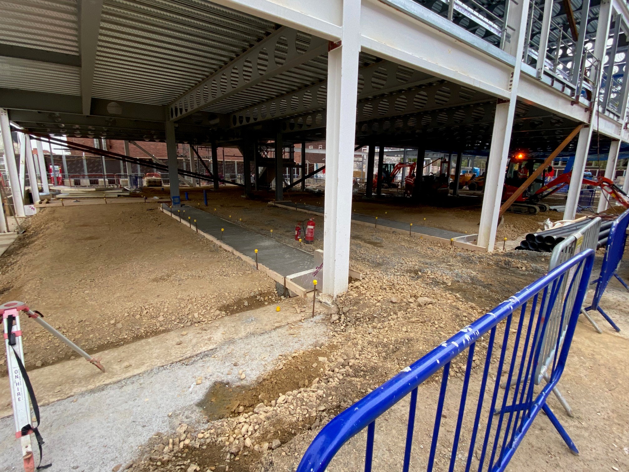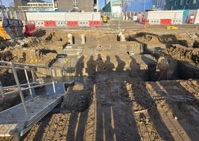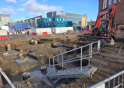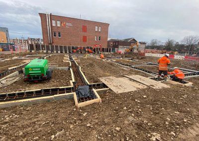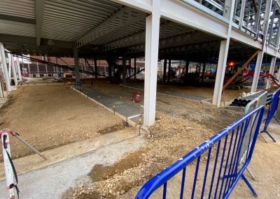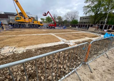 Our scope covered all major groundworks elements, including pile caps and ground beams, the formation of drainage networks with attenuation tanks, and the construction of ground floor slabs. Further works included installation of underground services and the delivery of extensive hard landscaping and street furniture to create a pedestrian-friendly public realm around the new facility.